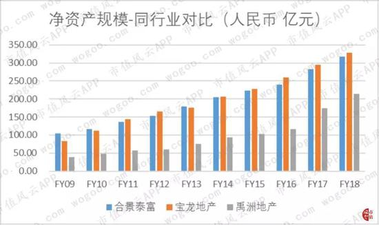 先对比一下资产规模。2018年,合景泰富总资产规模达到1845亿元,以2009年为基准,CAGR为23%。宝龙地产总资产规模为1321亿元,以2009年为基准,CAGR为27.8%。禹洲地产总资产规模为1151亿元,以2009年为基准,CAGR为29.6%。