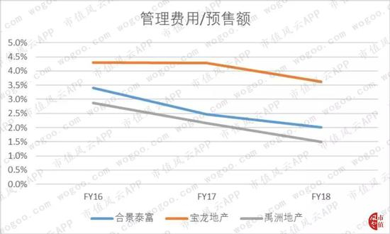 同样的,我们对比三家公司的管理费用占预售额的比重。合景泰富这一比例连续两年下降,2018年为2%。宝龙地产和禹洲地产的这一比例为3.6%和1.5%。