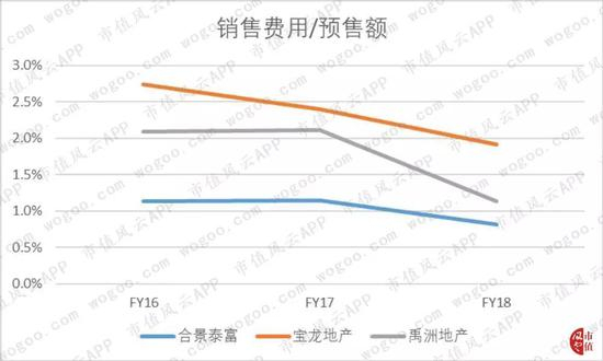 结合当年的预售金额来看,公司销售费用占预售额比重在三家公司中最低,并且同比有所下滑,2018年为0.8%,宝龙地产和禹洲地产分别为1.9%和1.1%。