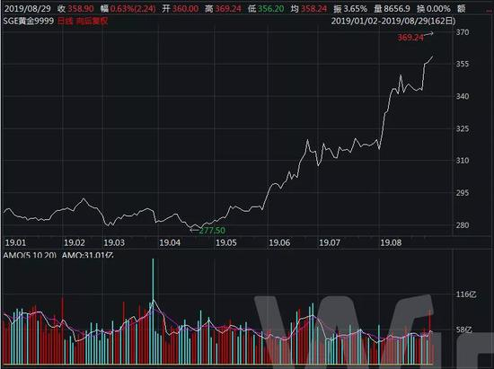 2019年,全球多家央行打出“降息牌”,市场对未来经济下行预期增强,投资者涌入黄金市场避险。国内金价打破6年来的低迷状态,截至8月27日,今年上涨近25%,成为最为耀眼的投资品种之一。