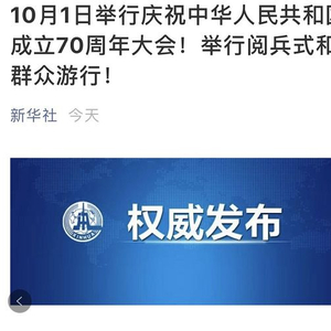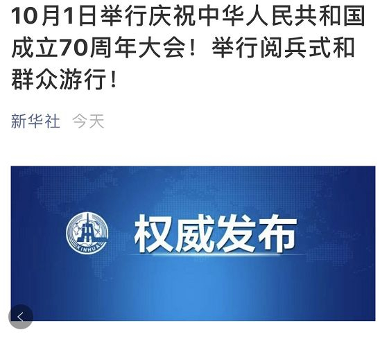 今日两大权威媒体人民网与新华网纷纷发布,庆祝中华人民共和国成立70周年大会将于10月1日举行,庆祝大会后将举行盛大阅兵式和群众游行。