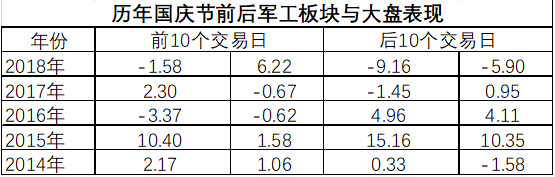 从近年来的数据来看,国庆节前后军工股的表现不一,国防军工指数跑赢大盘的胜率相对较大。