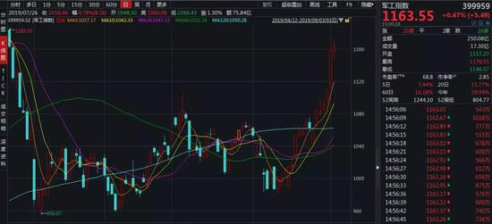 近期最热的板块是军工,军工指数从8月12日至今一直处于上升通道当中,涨幅已接近19%。
