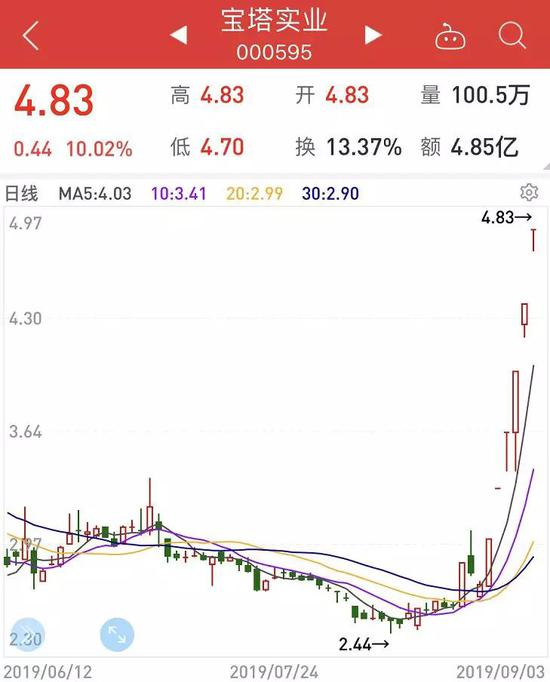 9月3日,宝塔实业再度涨停,收于4.83元。至此,宝塔实业已经连续收出6个涨停板。而在此之前的8月12日,该股最低价曾低至2.44元。也就是说,在经过17个交易日的上涨之后,宝塔实业股价已接近翻倍。