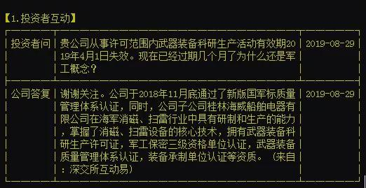 据该公司在投资者互动平台回应,公司于2018年11月底通过了新版国军标质量管理体系认证,同时,公司子公司桂林海威船舶电器有限公司在海军消磁、扫雷行业中具有研制和生产的能力,掌握了消磁、扫雷设备的核心技术,拥有武器装备科研生产许可证,军工保密三级资格单位认证,武器装备质量管理体系认证,装备承制单位认证等资质。