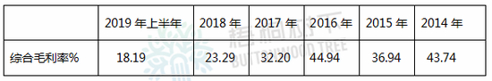 2017年上半年综合毛利率还是33.91%,2017年全年就下降到32.20%,2018年大幅下降到23.29%,2019年上半年只有18.19%了,相比2016年毛利率44.94%,下降59.52%。