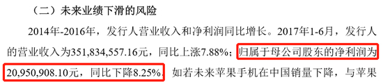 招股说明书(2017年11月6日报送)披露,2017年1-6月,公司的营业收入为3.518亿余元,同比上涨7.88%;归属于母公司股东的净利润为2095万元,同比下降8.25%。