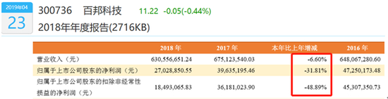 百邦科技于2018年1月9日深交所创业板上市。一上市就犯了不少A股公司上市就变脸的毛病,2018年营业收入比2017年小幅下降6.60%,但扣非归母净利润大幅下降48.89%,近乎腰斩。