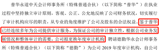 公司IPO申报时的审计机构为普华永道中天,按说公司上市后几年与IPO的中介机构关系都是挺好的,没有想到2019年7月,公司就更换普华永道中天为德勤华永。更换原因为:鉴于普华已经连续多年为公司提供审计服务,为保证公司的审计独立性,根据公司业务发展情况和整体审计的需要,公司拟更换年度审计机构,聘请德勤华永会计师事务所为公司 2019 年度审计机构。