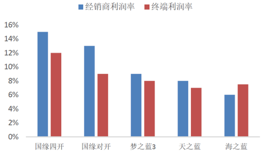 在流通渠道层面,今世缘切入较晚,但是渠道利润率高于洋河,根据招商证券研报,国缘对开相比天之蓝,国缘四开相比梦3,渠道利润率高出5-6%。终端利润率方面,也是国缘更高。在毛利率高于洋河的情况下,经销商自然更愿意陈列和推荐今世缘。