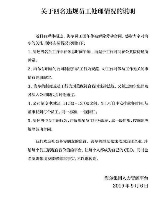 6日,就“员工因午休被解除合同”一事,海尔集团人力资源平台发布情况说明:所述四名员工并非在休息时间午睡,而是于工作时间在公共接待场所睡觉。行为违反海尔员工行为规范,属一级违规,按规定应解除劳动合同。