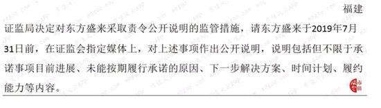 6月12日福建证监局马上做出反应,对东方盛来采取责令改正措施的决定,责令东方盛来在 2019年6月30日前完成承诺履行,并将这次违法承诺的行为记入证券期货市场诚信档案。