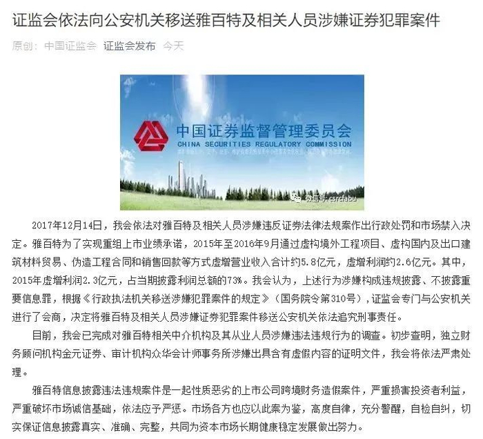 雅百特信息披露违法案是证监会查处的一起性质恶劣的上市公司跨境财务造假案。