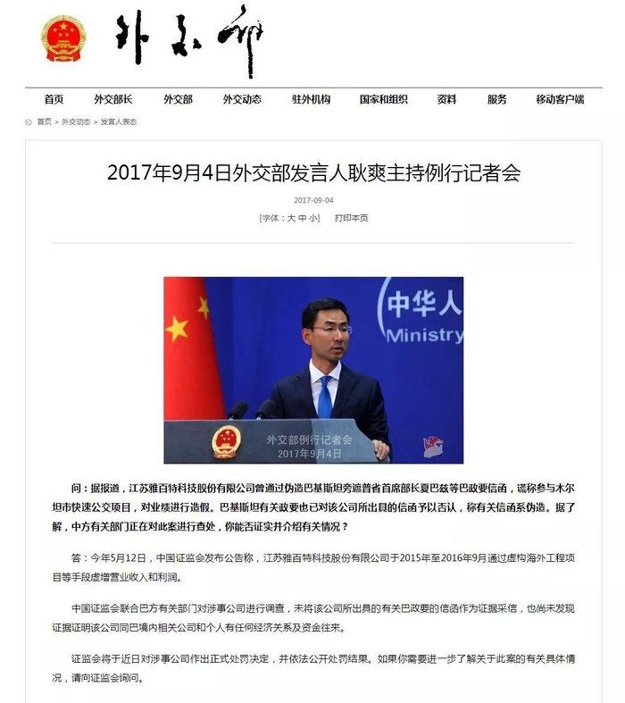 2017年9月,外交部发言人耿爽披露,经证监会联合巴基斯坦有关部门调查,雅百特所出具的有关巴政要的信函系伪造,也尚未发现证据证明,雅百特同巴境内任何公司和个人有经济关系及资金往来。