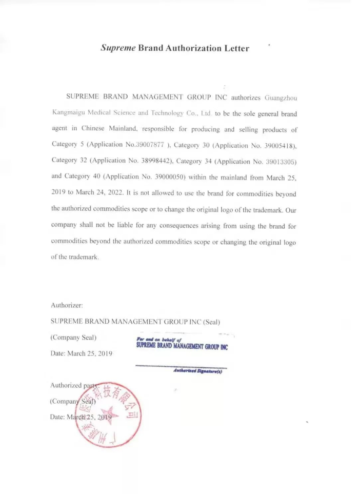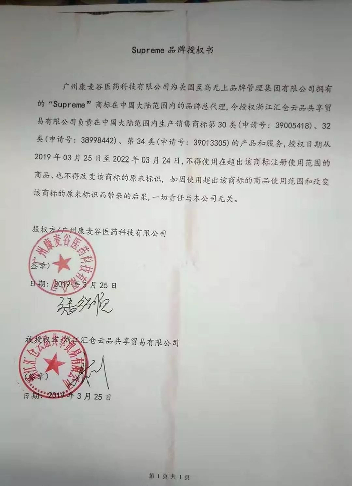 时间财经从多个经销商获取了该品牌的授权合同,该合同显示,广州康麦谷医药科技有限公司为美国至高无上品牌管理集团有限公司拥有的“Supreme”商标在大陆范围内的品牌总代理,今授权浙江汇仓云品共享贸易有限公司负责在中国大陆销售商标30类(申请号:39005418)、32类(申请号:38998442)等。