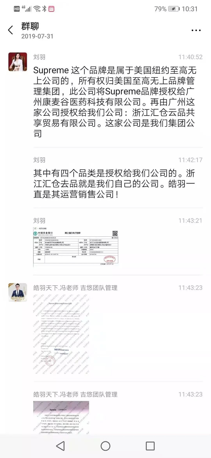 时间财经从代理商处获得一份代理商与皓羽天下CEO刘羽聊天记录显示,刘羽表示,“Supreme 这个品牌是属于美国纽约至高无上公司的,所有权归美国至高无上品牌管理集团,此公司将Supreme品牌授权给广州康麦谷医药科技有限公司。再由广州这家公司授权给我们公司:浙江汇仓云品共享贸易有限公司。这家公司是我们集团公司。”