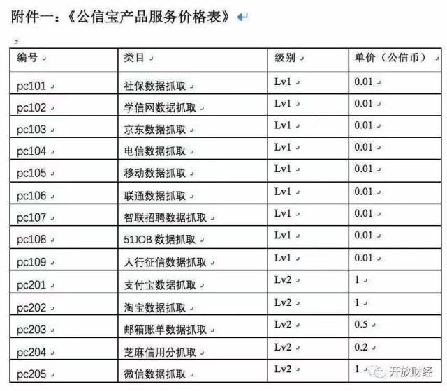 但问题是,谁给公信宝数据呢?根据公信宝的公开信息显示,其数据平台合作的商户包括了中国银联、中国联通、众安科技以及一些理财公司。而在去年的产品价格服务表中,公信宝介绍了其数据类型更是涵盖社保、学信网、京东、电信、移动、联通、智联招聘、芝麻信用分、微信、支付宝等。