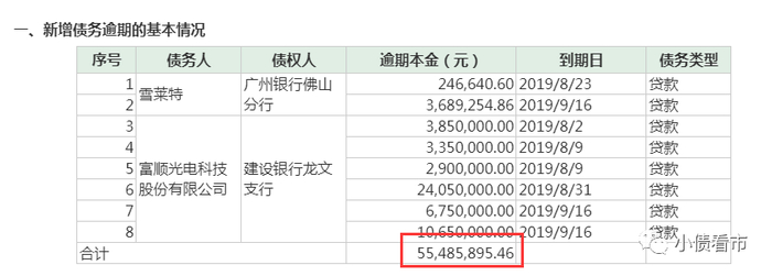 小债看市发现,这些逾期债务的违约主体主要是雪莱特和子公司富顺光电,债务类型包括贷款、融资租赁款、借款以及委托贷款等。