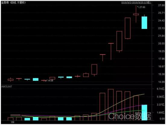 9月16日至24日,金奥博股价同样收获七连阳,其中包括一轮五连板,累计暴涨70%。在此期间,金奥博日内振幅连续多日超过10%,换手率连续多日超过50%。