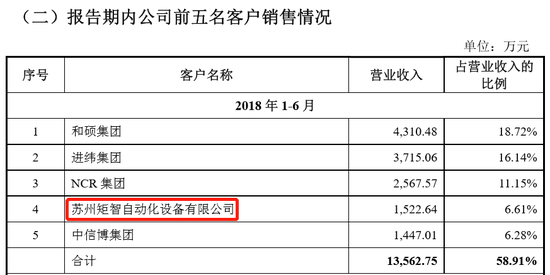 2015年、2016年、2017年,苏州矩智自动化设备有限公司都没有在前五大客户中,2018年上半年突然名列第4大客户。公司对苏州矩智销售1522.64万元,占公司营业收入的比例为6.61%。