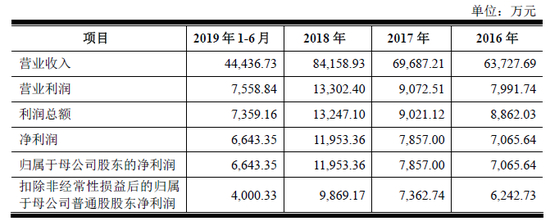 2016年、2017年、2018年及2019年上半年,公司实现营业收入分别为6.37亿元、6.97亿元、8.42亿元及4.44亿元,扣非归母净利润分别为6243万元、7363万元、9869万元及4000万元。