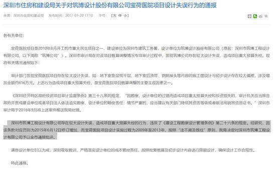 3、2017年曾因一医院项目设计失误被深圳市住建局通报批评