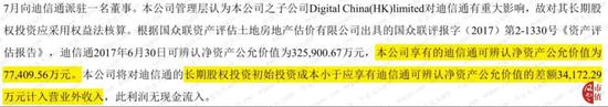 2017年4月28日,公司发布公告,其全资子公司Digital China(HK)Limited(以下简称“DCHK”)筹划以4.91亿港币(按照港币:人民币=1:0.8861的汇率折算,约人民币4.35亿元)收购北京迪信通商贸股份有限公司(06188.HK,以下简称“迪信通”)1.58亿股的股份,对价为3.1港元/股。