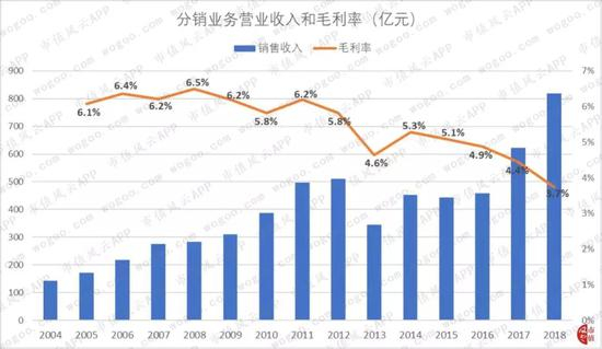 不过,出于分销业务特点,其毛利率一直较低,2004-2011年期间稳定在6%上下,随后逐渐下滑。而且上市后下滑速度加快,2018年分销业务毛利率仅为3.7%。