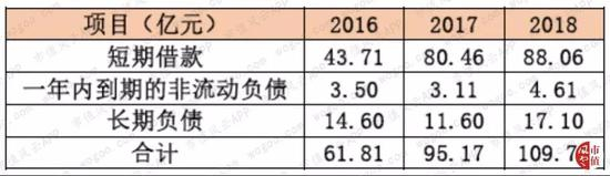 其主要以一年内的借款为主,2016-2018年有息负债合计从61.81亿升至109.77亿,大涨77.59%。截至2018年底,一年内需要偿还的负债达92.67亿元。