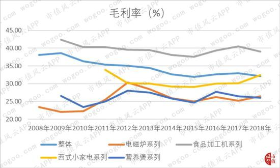 2008年以来,西式小家电、电磁炉、营养煲三个板块收入占比的不断提升,从而拉低了九阳股份整体的毛利率水平。