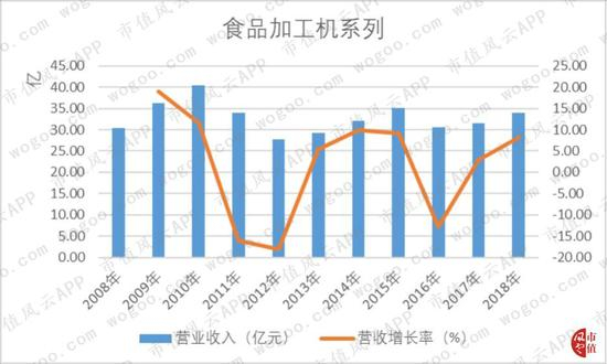 2018年,食品加工机板块实现营业收入34.08亿元,同比增速高达8.19%,仍未增长至2010年的最高收入规模。