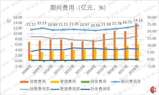 公司的期间费用主要由销售费用和管理费用构成;其中,2018年,销售费用为13.77亿元,同比增长了26%,管理费用(包含研发费用)为6.08亿元,同比增长了10%。