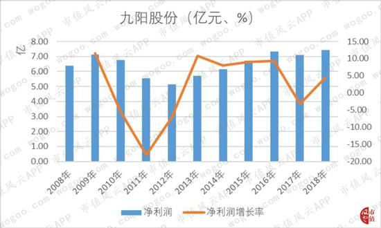 与营业收入相比,九阳股份的净利润增长则十分缓慢;2008-2018年期间,净利润的复合增长率仅1.49%;2018年,实现净利润7.42亿元。