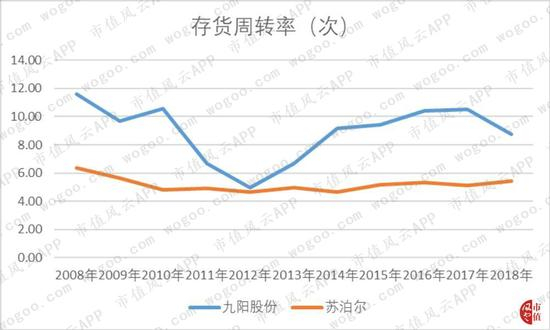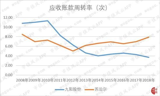 自2013年开始,九阳股份的应收账款周转率开始逐渐低于苏泊尔;其中,2018年,九阳股份、苏泊尔的应收账款周转率分别为3.70、7.93。
