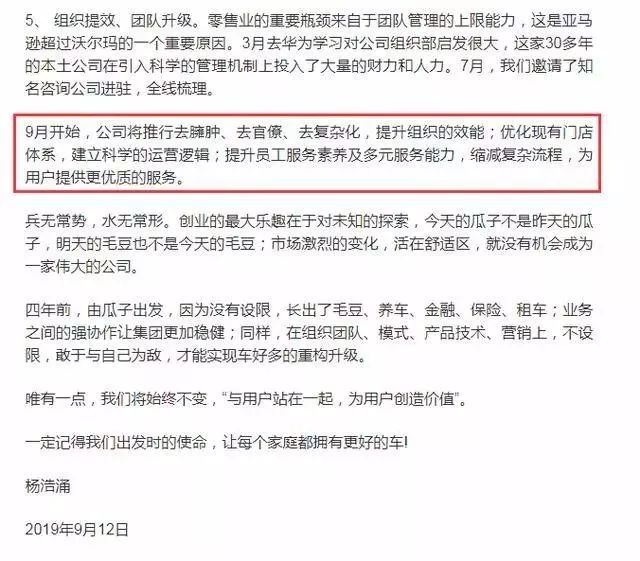 几乎在同一时间,瓜子二手车传出精简人员的消息。杨浩涌在内部信中也表示,“九月开始,公司将推行去臃肿、去官僚、去复杂化,提升组织的效能”。