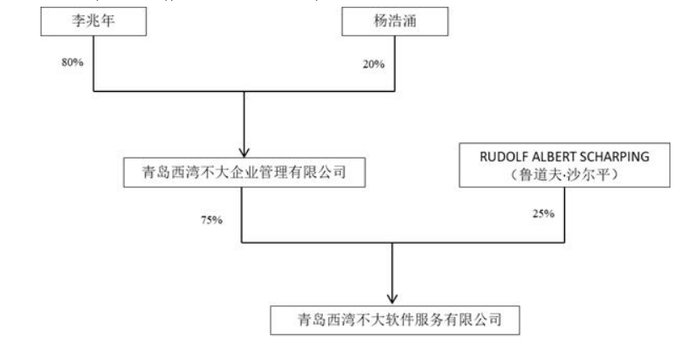 西湾软件注册于今年5月,由青岛西湾企管持有75%股权,鲁道夫·沙尔平持有另25%股权。李兆年和杨浩涌又分别持有西湾企管80%、20%股权,为西湾软件实际控制人。