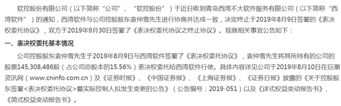 10月7日,软控股份发布公告称,实控人袁仲雪此前与杨浩涌、李兆年实控的青岛西湾软件签署的表决权委托协议和一致行动协议终止。
