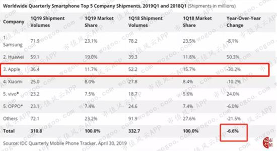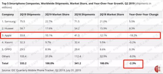 根据IDC提供的数据,全球智能手机出货量近两年都呈现下滑态势,其中苹果手机在2019年的下滑幅度尤为明显。2018年苹果手机出货量同比下滑3.2%,在2019年1季度和2季度出货量分别同比下滑30.2%和18.2%。