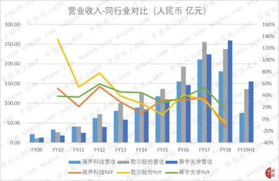 不出意外,三家公司的营收增速均在2018年实现下,其中瑞声科技的营收增速下滑最为明显。