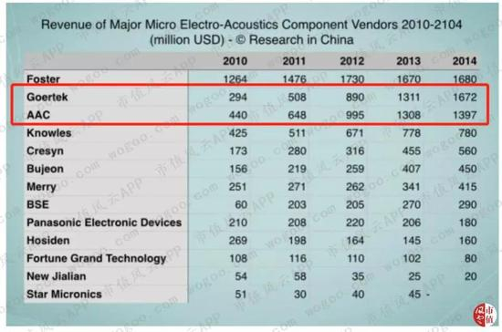 根据Research in China在2014年给出的一份报告中可以看到,按照全球主要微电子声学元件供应商的收入进行排名的话,歌尔股份(Goertek)和瑞声科技(AAC)已经在全球声学元件市场占有一席之地。