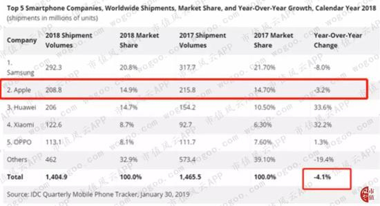 可以明显看到,2018年苹果贡献的营收以及营收占比均出现下滑,主要原因就是上面提到的iPhone出货量大幅下滑。