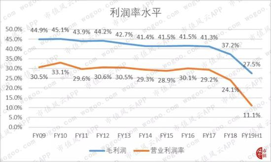 营业利润率从2017年的29.2%下滑至2018年的24.1%, 2019年上半年下滑至11.1%。利润率下滑非常明显。