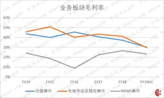 动圈器件的毛利率从2014年的43.9%下滑至2019年上半年的30.1%,电磁传动及精密器件的毛利率从2014年的45.7%下滑至2019年上半年的29.7%。MEMS器件的毛利率在2014年为24.2%,而2019年上半年为23.4%,略有下滑。