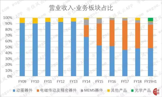 在2019年半年报中,动圈器件仍旧是公司最大收入来源,占比47.8%。其次是电磁传动及精密器件,占总营收40%。而光学、MEMS器件和其他产品则分别占总营业收入的6%、5%和1%。