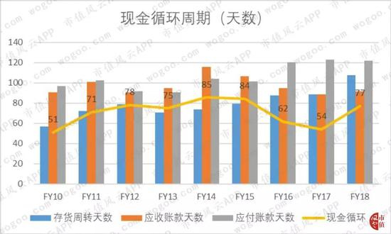 公司2018年现金循环周期为77天,同比增长23天,这个增长主要是因为存货周转天数的增长,而应收账款天数和应付账款天数基本持平。