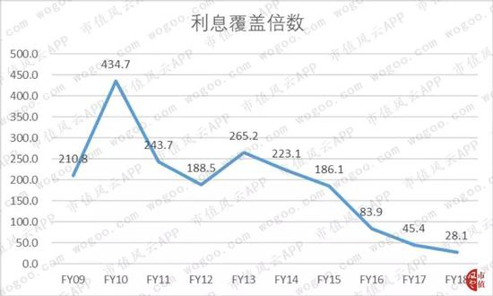 虽然公司利息覆盖倍数近年来一直下滑,但是最近年度的利息覆盖倍数仍旧有28.1,短期流动性没有压力。