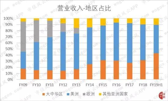 2019年上半年,大中华区(注:大中华区包括中国大陆、中国香港及中国台湾,大中华区的大部分收入来自中国大陆)贡献的营收占比为43%,美洲的营收占比为46.4%,欧洲的营收占比为0.2%,其他亚洲国家贡献的营收占比为10.4%。