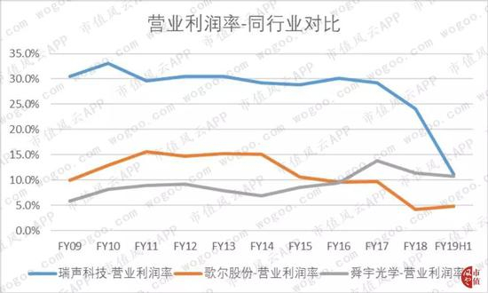再来看一下三家公司的利润率水平,2017年的时候瑞声科技利润率贼高,市场上独一份,现在如何?