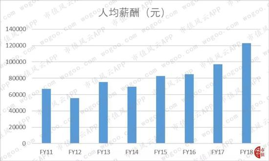 自2014年以来,人均薪酬也逐年上涨。2018年,人均薪酬为12.3万元,同比增长26.4%,以2011年为基准,CAGR为9%。人均薪酬的年化复合增长率略高于人均产值,这对于公司和员工来说,是一个皆大欢喜的局面。