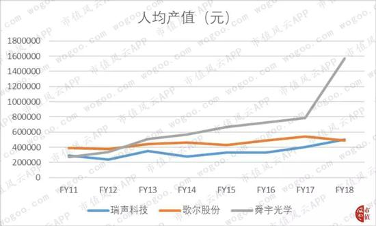 在三家公司当中,瑞声科技的人均产值最低,2018年瑞声科技和舜宇光学都是通过减少员工数量的方式实现的人均产值的上升。